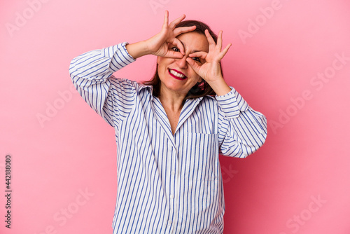 Middle age caucasian woman isolated on pink background showing okay sign over eyes