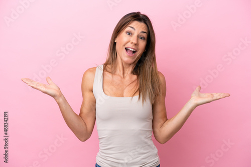 Middle age caucasian woman isolated on pink background with shocked facial expression