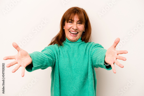 Middle age caucasian woman isolated on white background feels confident giving a hug to the camera.
