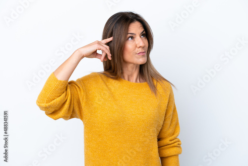 Middle age caucasian woman isolated on white background making the gesture of madness putting finger on the head