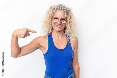 Middle age caucasian woman isolated on white background person pointing by hand to a shirt copy space, proud and confident