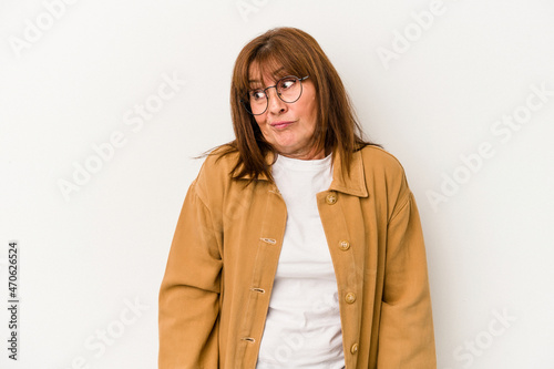 Middle age caucasian woman isolated on white background shrugs shoulders and open eyes confused.