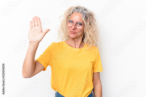 Middle age caucasian woman isolated on white background smiling cheerful showing number five with fingers.