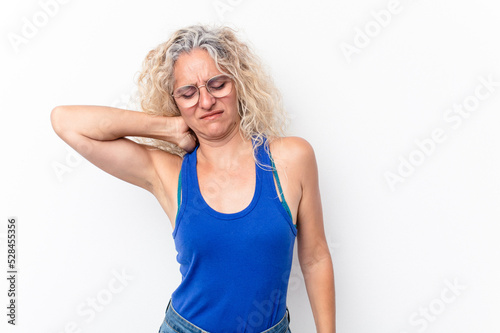 Middle age caucasian woman isolated on white background suffering neck pain due to sedentary lifestyle.