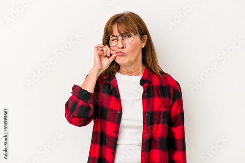 Middle age caucasian woman isolated on white background with fingers on lips keeping a secret.