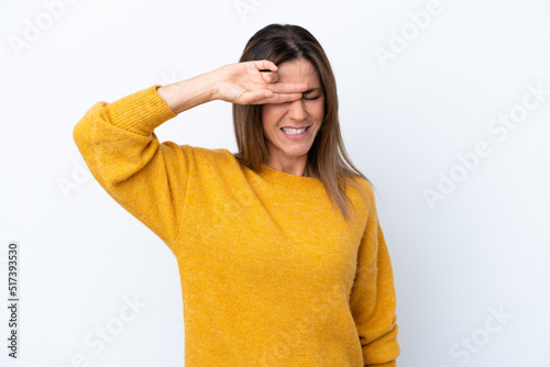 Middle age caucasian woman isolated on white background with tired and sick expression