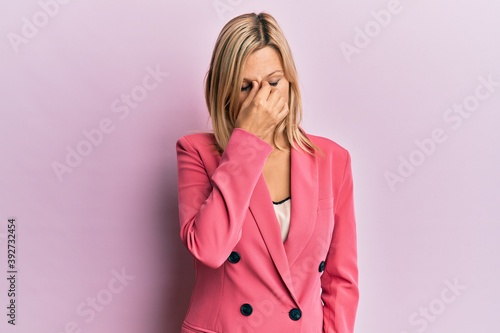 Middle age caucasian woman wearing business jacket tired rubbing nose and eyes feeling fatigue and headache. stress and frustration concept.