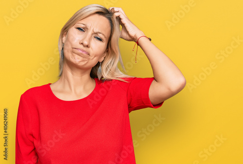 Middle age caucasian woman wearing casual clothes confuse and wonder about question. uncertain with doubt, thinking with hand on head. pensive concept.