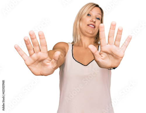 Middle age caucasian woman wearing casual clothes doing stop gesture with hands palms, angry and frustration expression