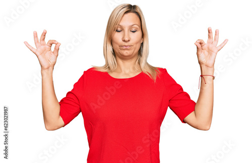 Middle age caucasian woman wearing casual clothes relax and smiling with eyes closed doing meditation gesture with fingers. yoga concept.