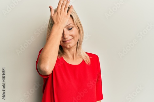 Middle age caucasian woman wearing casual clothes surprised with hand on head for mistake, remember error. forgot, bad memory concept.