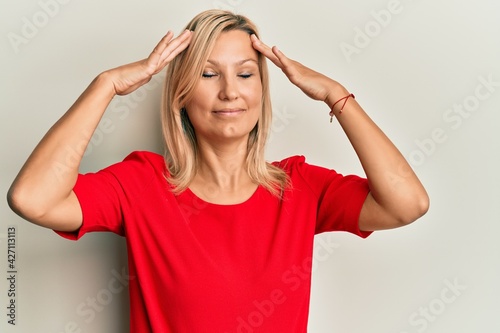Middle age caucasian woman wearing casual clothes with hand on head, headache because stress. suffering migraine.