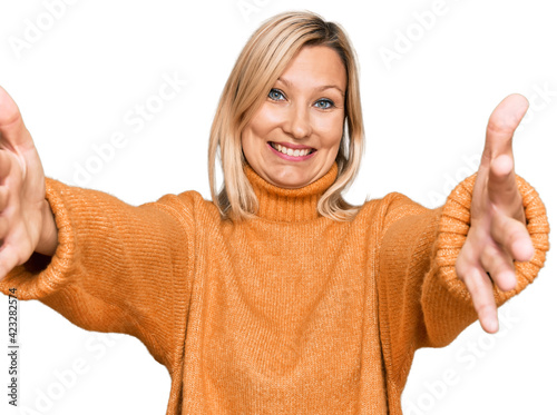 Middle age caucasian woman wearing casual winter sweater looking at the camera smiling with open arms for hug. cheerful expression embracing happiness.
