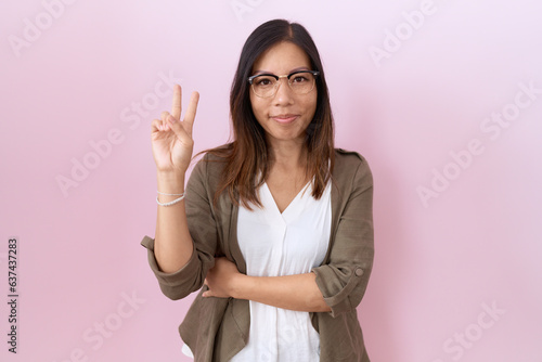 Middle age chinese woman wearing glasses over pink background smiling with happy face winking at the camera doing victory sign. number two.