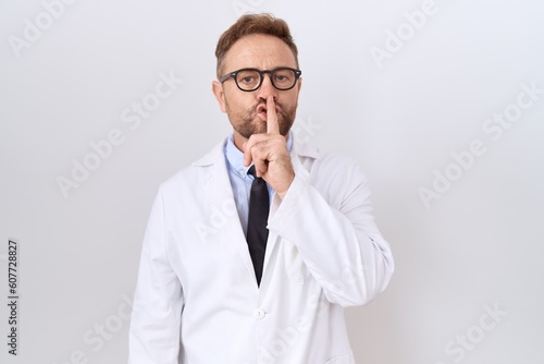 Middle age doctor man with beard wearing white coat asking to be quiet with finger on lips. silence and secret concept.