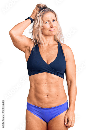 Middle age fit blonde woman wearing bikini confuse and wonder about question. uncertain with doubt, thinking with hand on head. pensive concept.