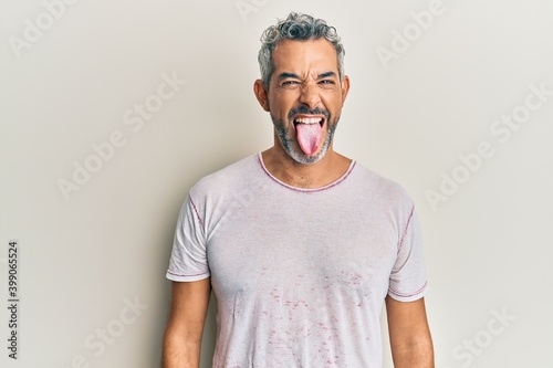Middle age grey-haired man wearing casual clothes sticking tongue out happy with funny expression. emotion concept.