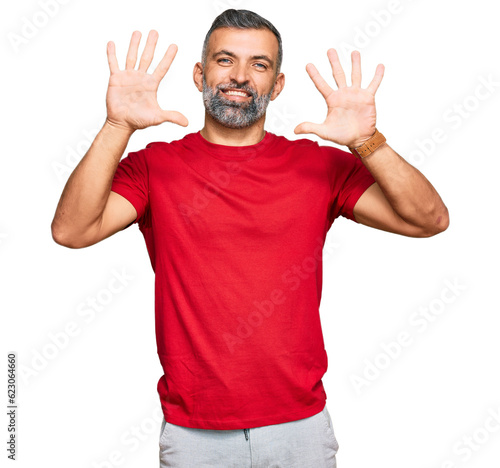 Middle age handsome man wearing casual clothes showing and pointing up with fingers number ten while smiling confident and happy.