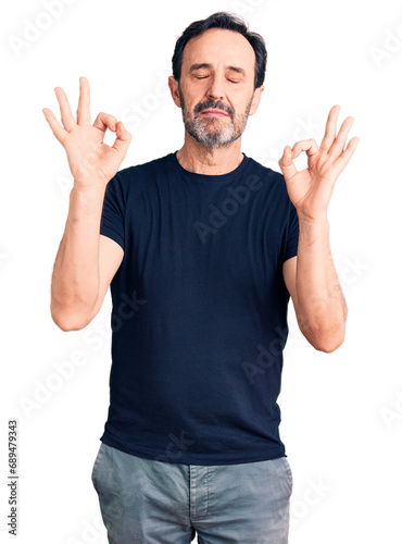 Middle age handsome man wearing casual t-shirt relax and smiling with eyes closed doing meditation gesture with fingers. yoga concept.
