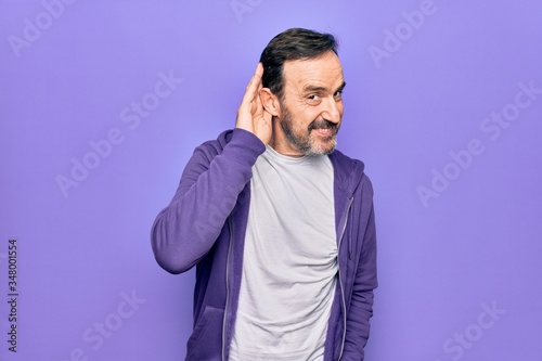 Middle age handsome sporty man wearing casual purple sweatshirt over isolated background smiling with hand over ear listening and hearing to rumor or gossip. Deafness concept.