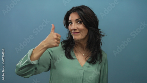 Middle age hispanic woman in green blouse showing thumbs up gesture facing camera in studio setting; approval.