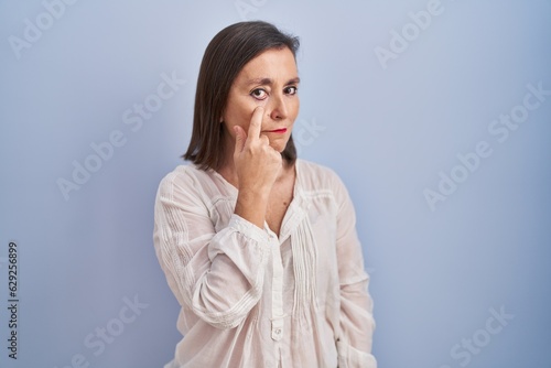 Middle age hispanic woman standing over blue background pointing to the eye watching you gesture, suspicious expression