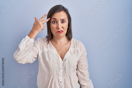 Middle age hispanic woman standing over blue background shooting and killing oneself pointing hand and fingers to head like gun, suicide gesture.
