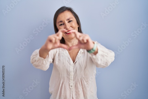 Middle age hispanic woman standing over blue background smiling in love doing heart symbol shape with hands. romantic concept.