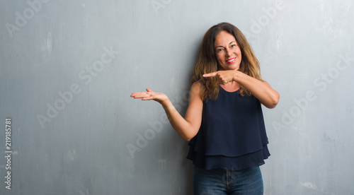 Middle age hispanic woman standing over grey grunge wall amazed and smiling to the camera while presenting with hand and pointing with finger.