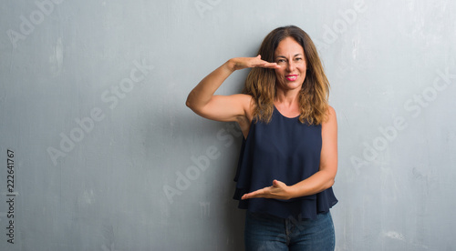 Middle age hispanic woman standing over grey grunge wall gesturing with hands showing big and large size sign, measure symbol. Smiling looking at the camera. Measuring concept.