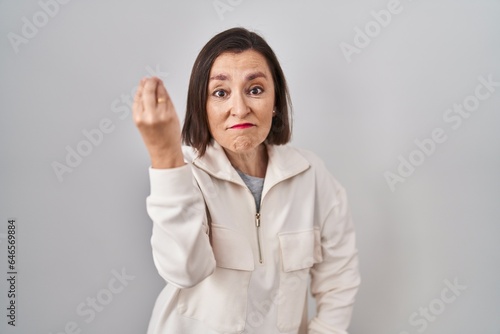 Middle age hispanic woman standing over isolated background doing italian gesture with hand and fingers confident expression