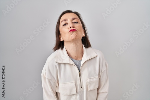 Middle age hispanic woman standing over isolated background looking at the camera blowing a kiss on air being lovely and sexy. love expression.