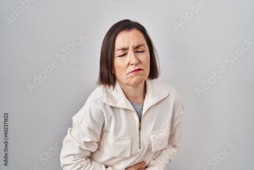 Middle age hispanic woman standing over isolated background with hand on stomach because indigestion, painful illness feeling unwell. ache concept.