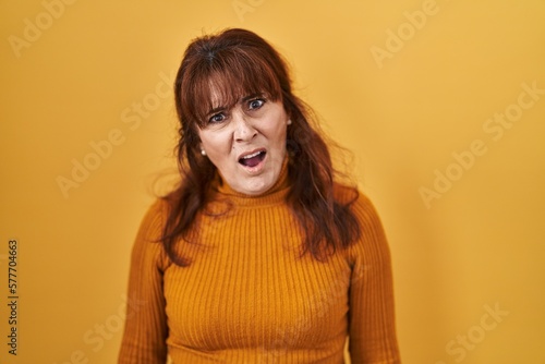 Middle age hispanic woman standing over yellow background in shock face, looking skeptical and sarcastic, surprised with open mouth