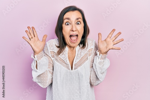 Middle age hispanic woman wearing casual clothes celebrating crazy and amazed for success with arms raised and open eyes screaming excited. winner concept