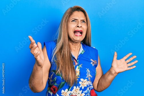 Middle age hispanic woman wearing casual clothes crazy and mad shouting and yelling with aggressive expression and arms raised. frustration concept.