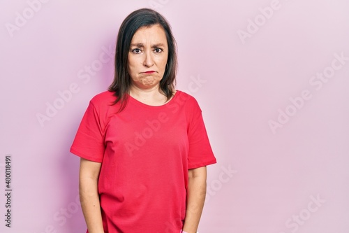 Middle age hispanic woman wearing casual clothes depressed and worry for distress, crying angry and afraid. sad expression.