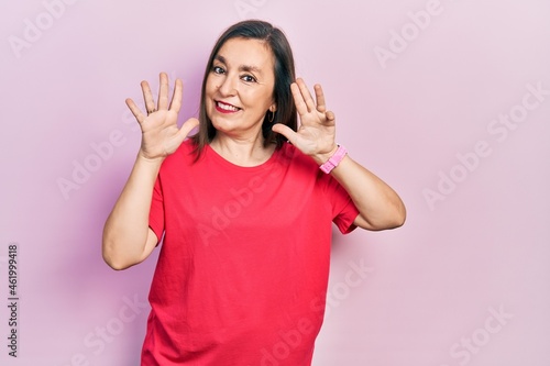 Middle age hispanic woman wearing casual clothes showing and pointing up with fingers number nine while smiling confident and happy.