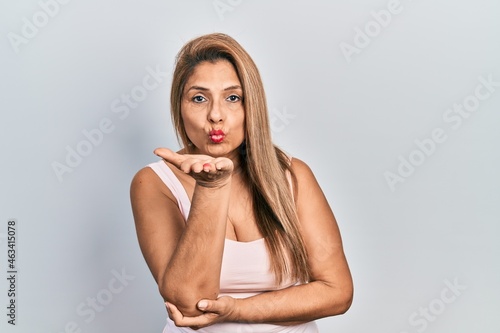 Middle age hispanic woman wearing casual style with sleeveless shirt looking at the camera blowing a kiss with hand on air being lovely and sexy. love expression.
