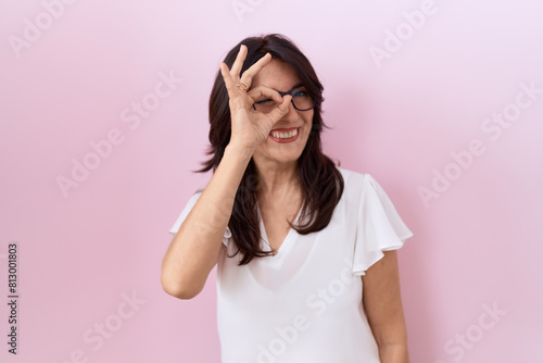 Middle age hispanic woman wearing casual white t shirt and glasses doing ok gesture with hand smiling, eye looking through fingers with happy face.