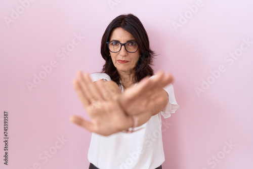 Middle age hispanic woman wearing casual white t shirt and glasses rejection expression crossing arms and palms doing negative sign, angry face