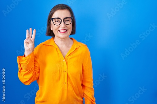 Middle age hispanic woman wearing glasses standing over blue background showing and pointing up with fingers number three while smiling confident and happy.