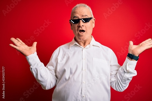 Middle age hoary man wearing funny sunglasses over isolated red background celebrating crazy and amazed for success with arms raised and open eyes screaming excited. Winner concept