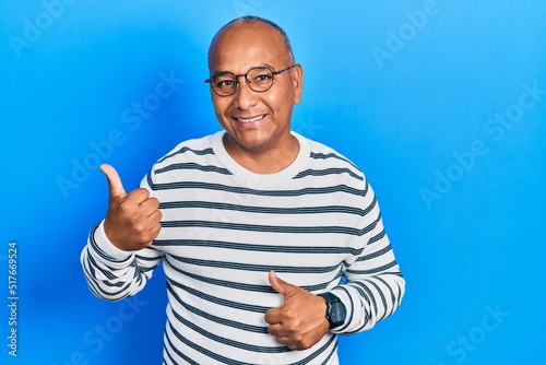 Middle age latin man wearing casual clothes and glasses pointing to the back behind with hand and thumbs up, smiling confident