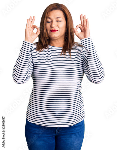 Middle age latin woman wearing casual clothes relax and smiling with eyes closed doing meditation gesture with fingers. yoga concept.