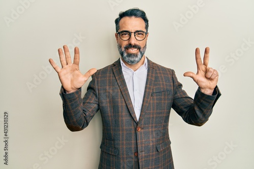 Middle age man with beard and grey hair wearing business jacket and glasses showing and pointing up with fingers number eight while smiling confident and happy.
