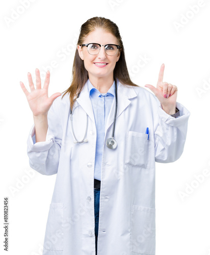 Middle age mature doctor woman wearing medical coat over isolated background showing and pointing up with fingers number seven while smiling confident and happy.