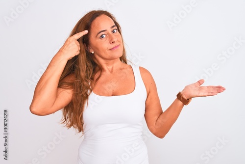 Middle age mature woman standing over white isolated background confused and annoyed with open palm showing copy space and pointing finger to forehead. Think about it.
