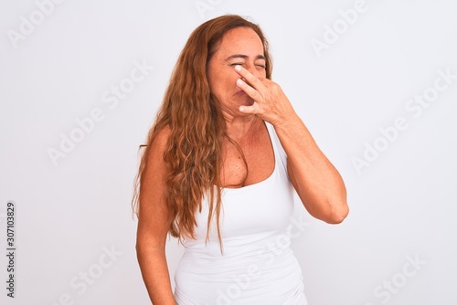 Middle age mature woman standing over white isolated background smelling something stinky and disgusting, intolerable smell, holding breath with fingers on nose. Bad smells concept.