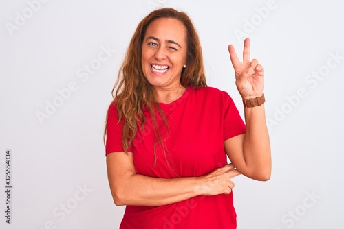 Middle age mature woman standing over white isolated background smiling with happy face winking at the camera doing victory sign. Number two.